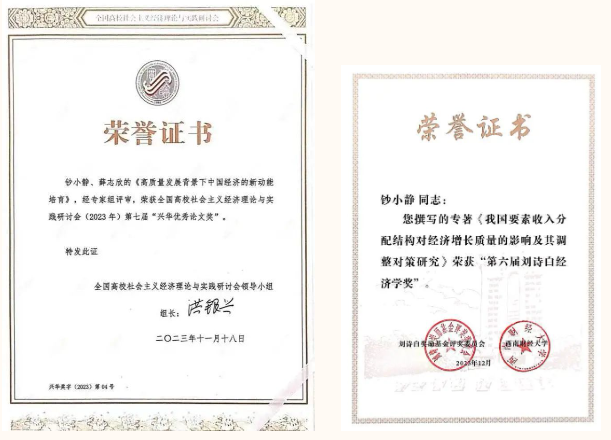 高层次学术获奖取得重要进展,钞小静教授先后获得“兴华优秀论文奖”、“第六届刘诗白经济学奖”。