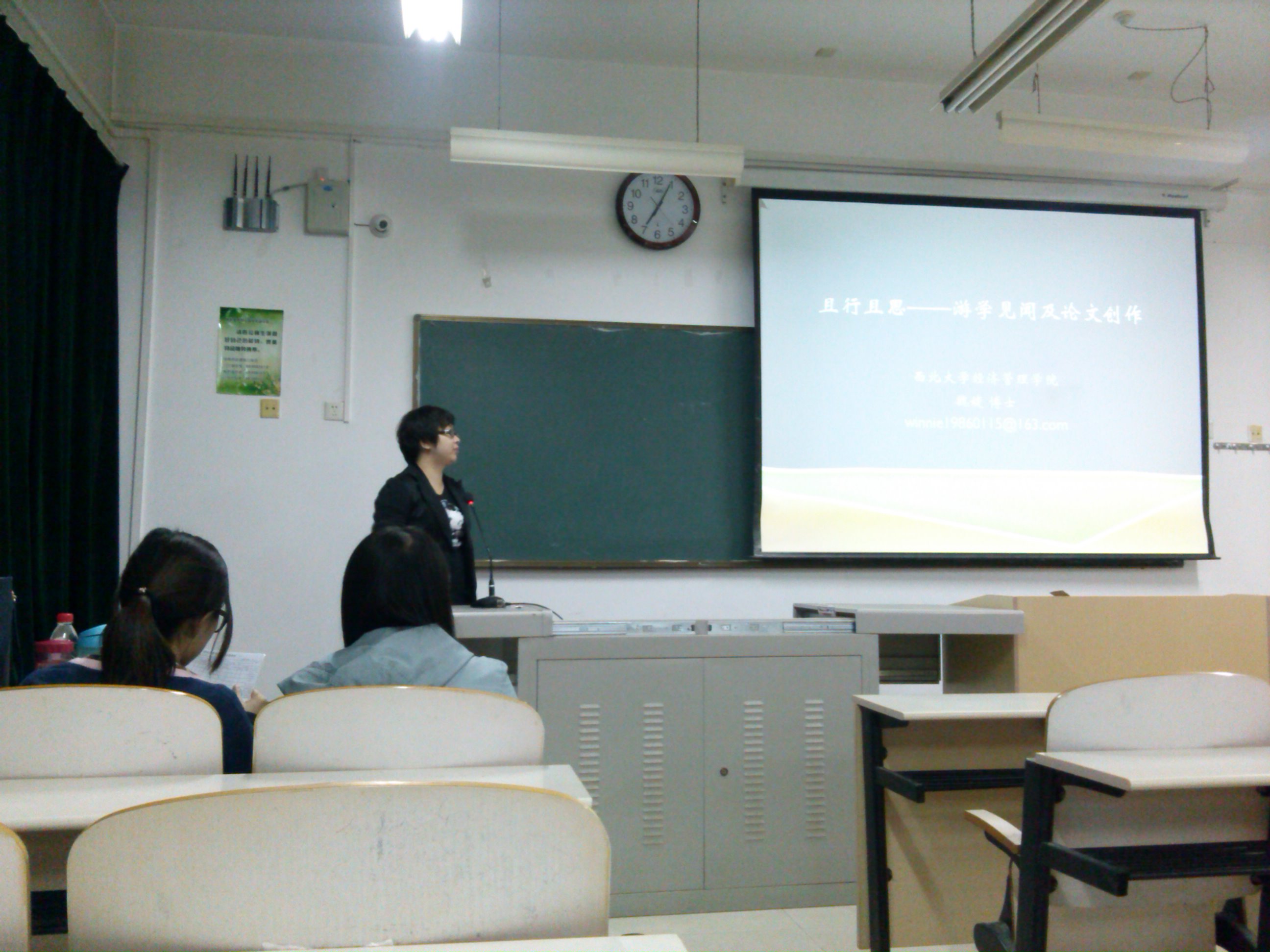 10月23日晚7点,“经曰管云”系列学术论坛第二十五讲暨第七届研究生学术活动月学术讲座第九场在1307教室顺利举行,2010级西方经济学博士魏婕作了题为 《且行且思——游学见闻及论文创造》的报告,100余名研究生参与了此次报告。